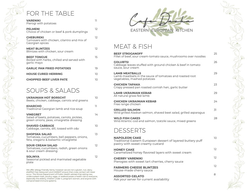 Cafe Dacha is a hidden gem located in the heart of Highland Park, Illinois, at 675 Central Ave. This charming cafe invites you to experience a blend of traditional European and Ukrainian cuisine. With a reputation for quality and authenticity, Cafe Dacha has caught the attention of food lovers and casual diners alike.